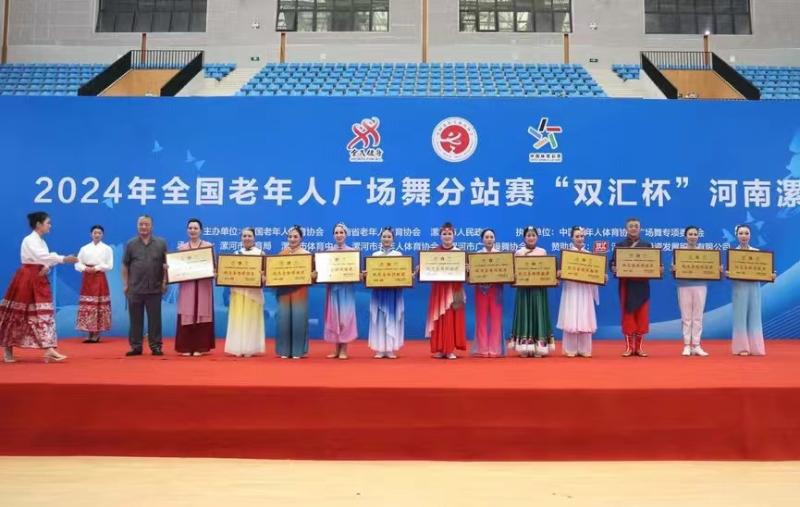 5月8日至10日,2024年全国老年人广场舞分站赛“双汇杯”河南漯河站在漯河医专召陵校区体育馆举行。来自安徽、陕西、浙江以及河南省各地市的33支代表队、500余名参赛队员参加了此次比赛。驻马店市驿城区老年人体育协会代表队荣获了四项大奖。