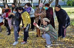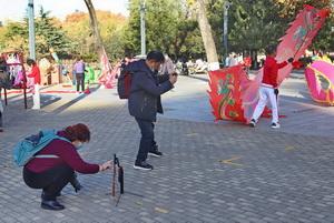 上午九点,空竹委员会、太极拳委员会、舞龙队、平顶山民族阳光舞团的老年健身爱好者,抖起了空竹、打起了花棍、舞起了彩龙,打起了太极剑、太极扇,跳起了民族舞,配合现场拍摄活动。在现场,来自三个教学点的160多名摄影爱好者们,分散在多个拍摄地点进行了手机人像摄影、手机全景模式摄影等摄影项目的拍摄,大家一边拍摄、一边相互间进行交流、探讨。活动进行中精彩的展示吸引了在公园游园的市民和正在公园游玩的幼儿园的小朋友们,小朋友们鼓掌叫好,围观的市民们也纷纷拿起自己手中的相机、手机,参加到拍摄活动中并现场咨询要求参加老年体协摄影公益大讲堂的学习。