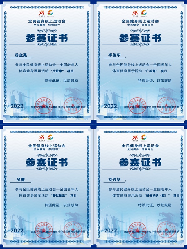 全国共47758人参加此次活动,太极拳、健身秧歌(鼓)、持杖健走(含手杖操)获奖比例为参加队伍的40%为优胜奖、60%为优秀奖;广场舞按照上传视频的 20%和 30%比例评出优胜奖和优秀奖。经过两个月的教学和培训,我市上传的比赛视频健身秧歌规定套路《全国第四套健身秧歌》、自编套路《沂蒙颂》、手杖操规定套路《燃烧吧蔬菜》、广场舞自编套路《水影叠香》均获得优胜奖;太极拳项目黄治平的陈氏26式太极拳、杨金霞的陈氏49式太极剑等10人获得优胜奖,1人获得优秀奖。