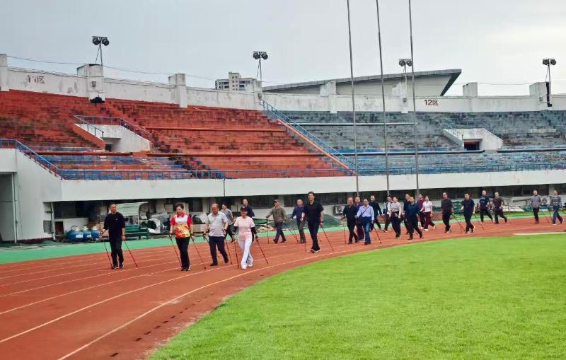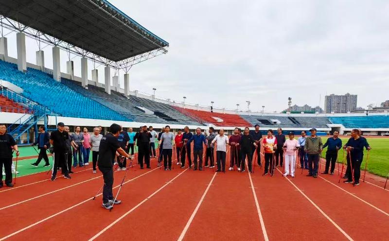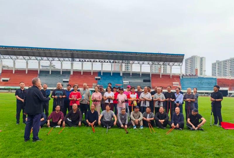 下午15时,实操培训在市体育运动中心操场准时开始,参与人数增至七十余人。宋老师重点围绕持杖方法、行走技术要领、注意事项等核心内容进行了细致的现场示范和分解教学。随后,他亲自带领全体学员进行实地健走练习,并在行进过程中逐一进行个性化指导与纠正。学员们学习态度认真,听得专注,走得投入,经过数轮反复练习,大家的动作逐渐规范,已能做到“持杖健走,有模有样”。整个实操培训历时两小时,内容充实,效果显著,令所有参训者受益匪浅。